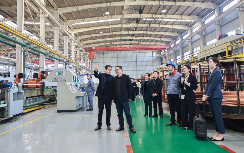 在金田铜业总裁楼城的陪同下,鲁副董事长一行先后参观了企业的高精密内螺纹制冷铜管车间、高精度铜带车间、科田磁业生产车间等大型智能化生产车间,深入了解了企业重要产品的产品性能、工艺流程、市场应用以及公司数字化车间、5G+智慧工厂建设的进度和成效等。