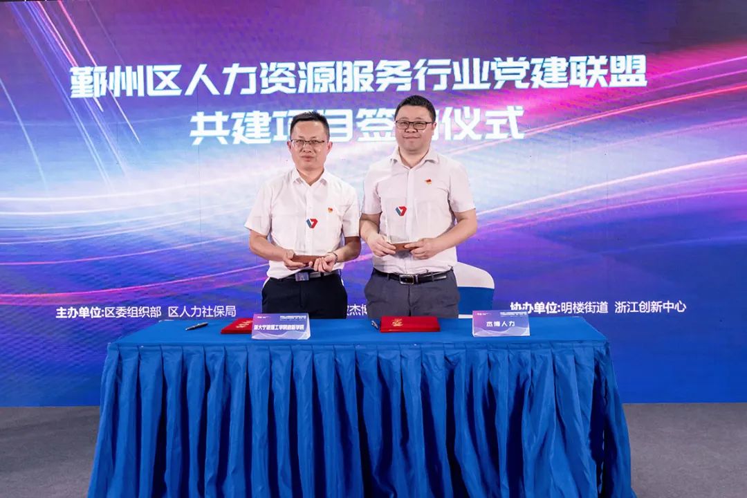 为推进公司高水平创新人才培养,加强员工创新创业教育,促进体育艺术教育交流合作,2022年6月17日下午,启新公司党支部在鄞州区人力资源服务行业党委成立仪式暨人力资源服务行业党建联盟“益企•鄞未来”活动上与2022年浙商全国500强宁波杰博人力资源有限公司党支部共建党建联盟。