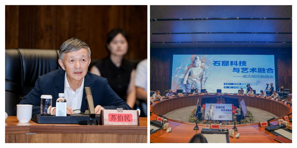 在随后的研讨会上,敦煌研究院经理苏伯民作了《石窟科技与艺术融合——助力现代制造业》的精彩主旨报告,他认为传统文化的精髓与灵感,有助于制造业企业打破固有的思维模式,增强产品的文化内容。比如,敦煌壁画的色彩搭配、图案形式、人物场景等都能给如今的产品设计带来新的启示。近年来,随着“国潮风”的兴起,敦煌文化成为国潮中最为炙手可热的IP之一。敦煌设计研究院顺势而为,已联手维格娜丝、徕卡、小米、kindle、良品铺子等品牌,开发了一系列产品。这些产品的工业设计和外观当中,吸收了传统文化的元素,通过二次创作,成功突破了古典艺术与现代前卫文化的界限。从丝路文化中提炼关键内容,结合现代审美标准,让敦煌传统文化艺术焕发新生命的同时,也让工业产品更具特色。