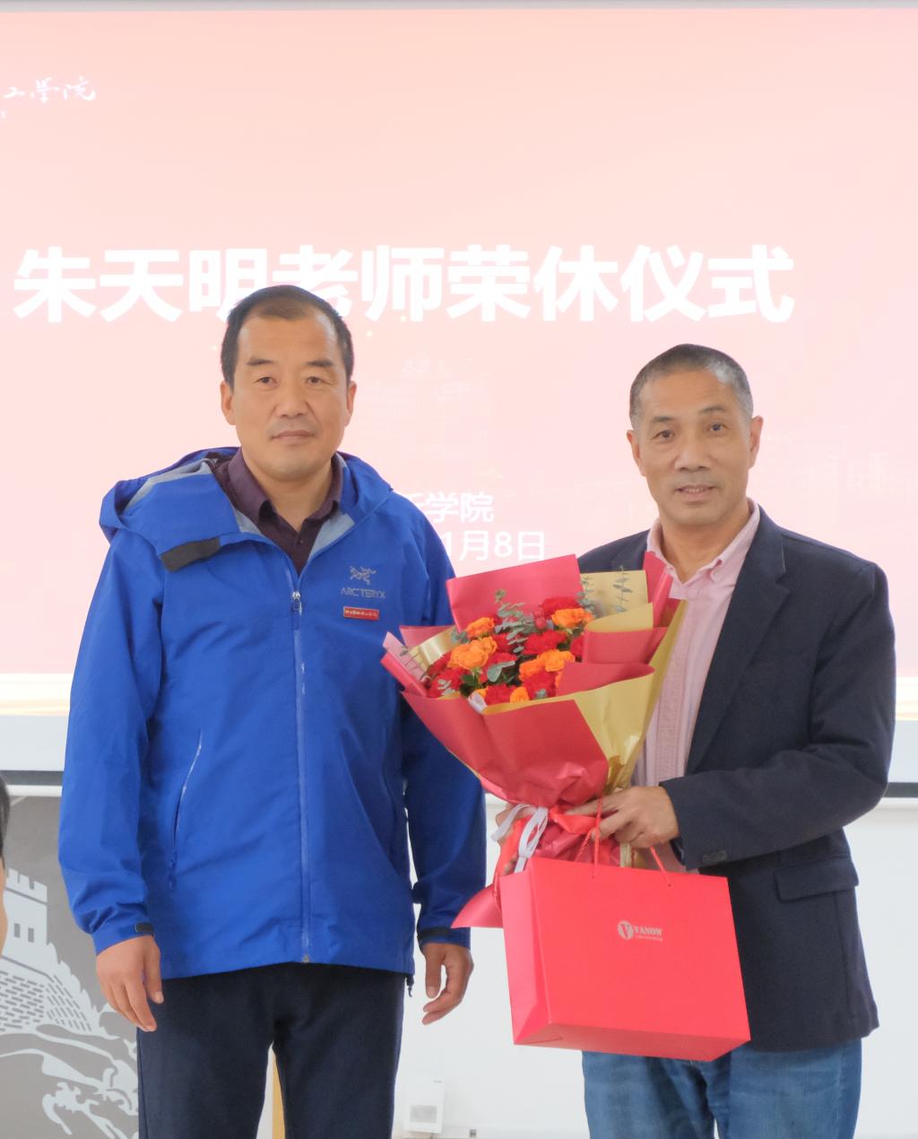 会议首先为刚刚退休的老领导、老教师朱天明老师举行了简单而隆重的荣休仪式,并由公司副经理史光辉为朱天明老师献上退休纪念品和鲜花。