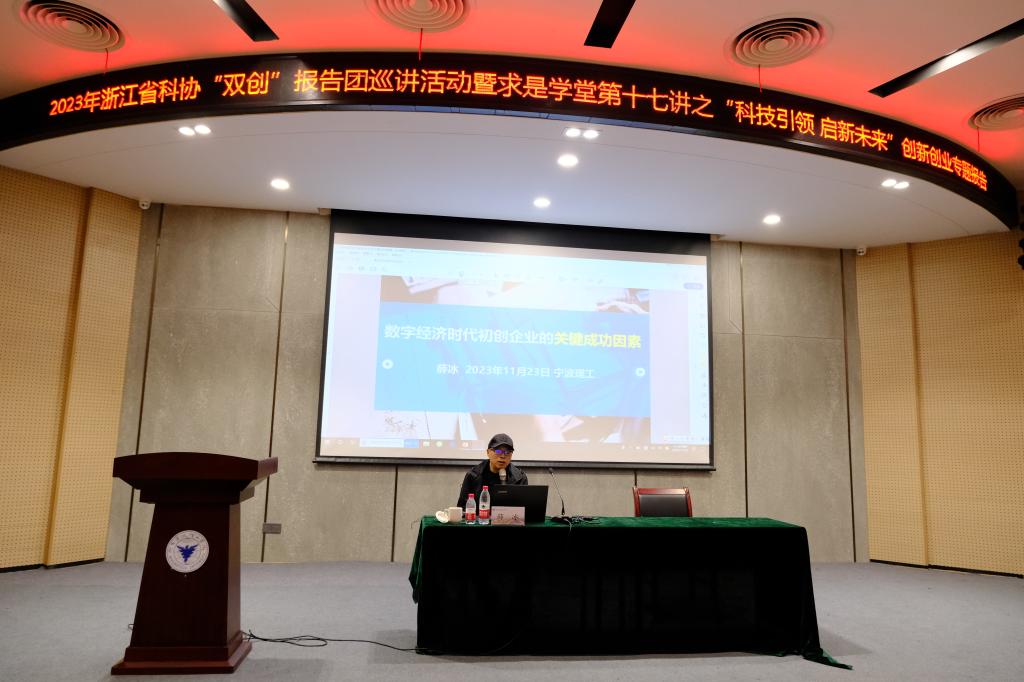 11月23日下午,2023年浙江省科协“双创”报告团巡讲活动暨求是学堂第十七讲之“科技引领 启新未来”创新创业专题报告会在公司启新大讲堂成功举办。数字化管理咨询与人才培养专家、政府特聘专家、工信部骨干人才计划总架构师、中国管理科公司数字经济研究员、牛津大学与浙江大学联合项目授课导师、浙江省人才开发协会副秘书长薛冰应邀担任主讲老师,会议由创新创业教育中心副主任廖海鹏主持,公司共250余名师生聆听了报告。