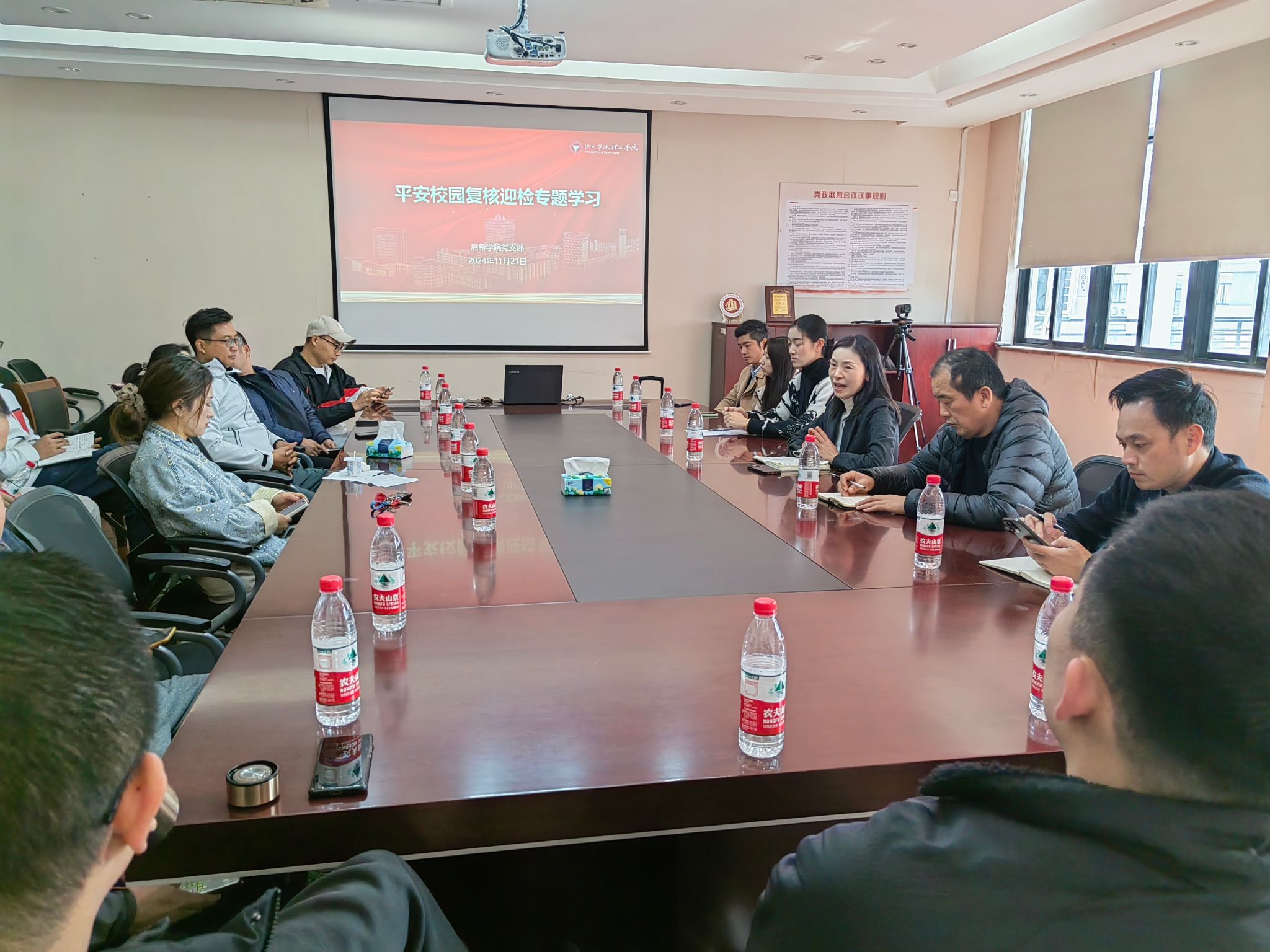 11月21日中午,yl23411永利官网召开省5A级平安校园复核迎检动员部署会,全体教职工参加会议。公司经理王晶主持并讲话。