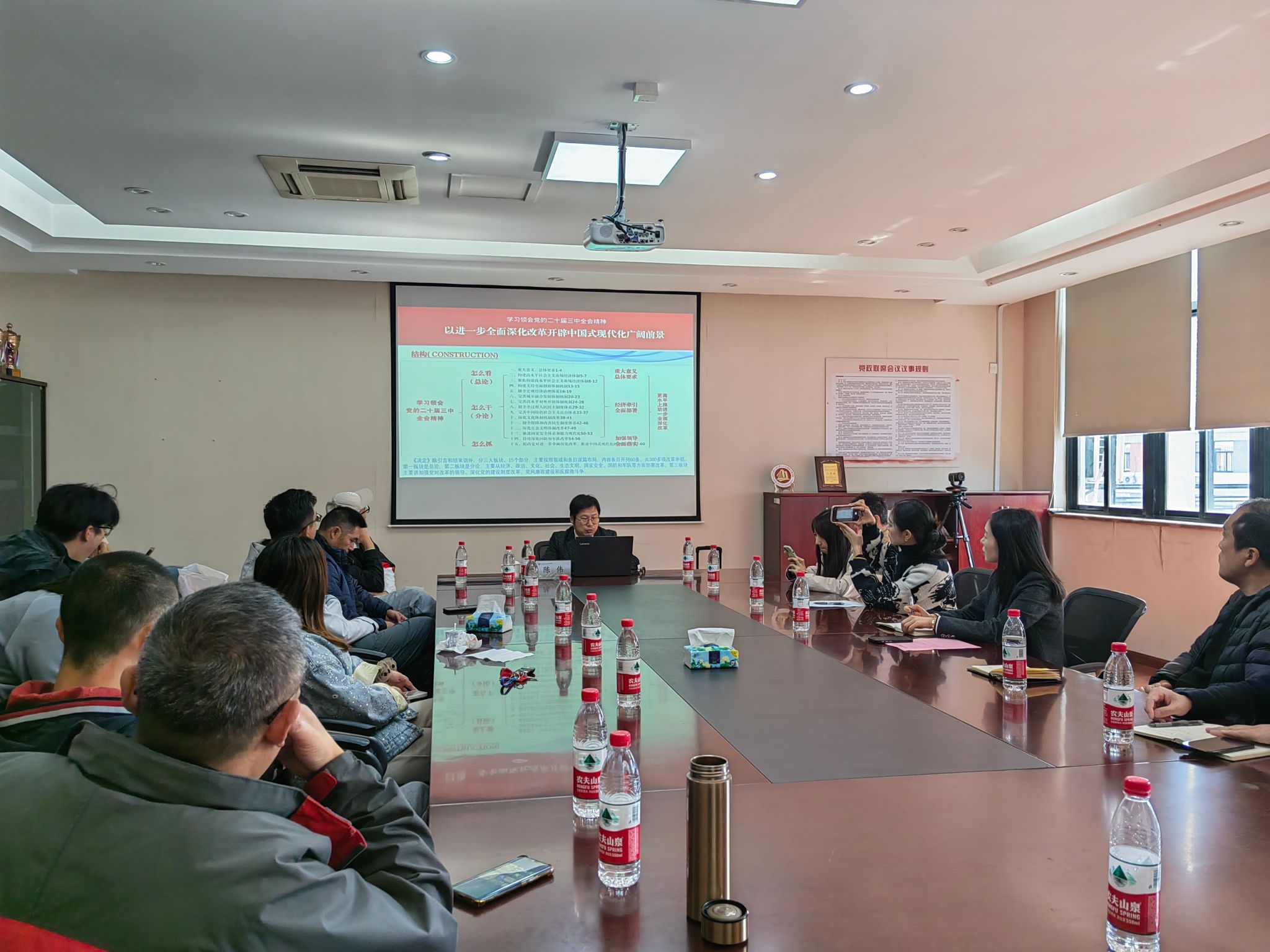 会议进行理论专题学习。邀请马克思主义公司教工第一党支部书记陈伟作学习党的二十届三中全会精神专题辅导报告。陈伟以《改革开放与中国式现代化》为题,深入剖析了改革开放的历史背景及其背后的理论逻辑,全面系统地阐述了党的二十届三中全会精神的发展脉络与核心内涵。同时,他还结合全国教育大会精神,梳理智库报告深入解读习近平总书记关于体育和美育的重要论述。