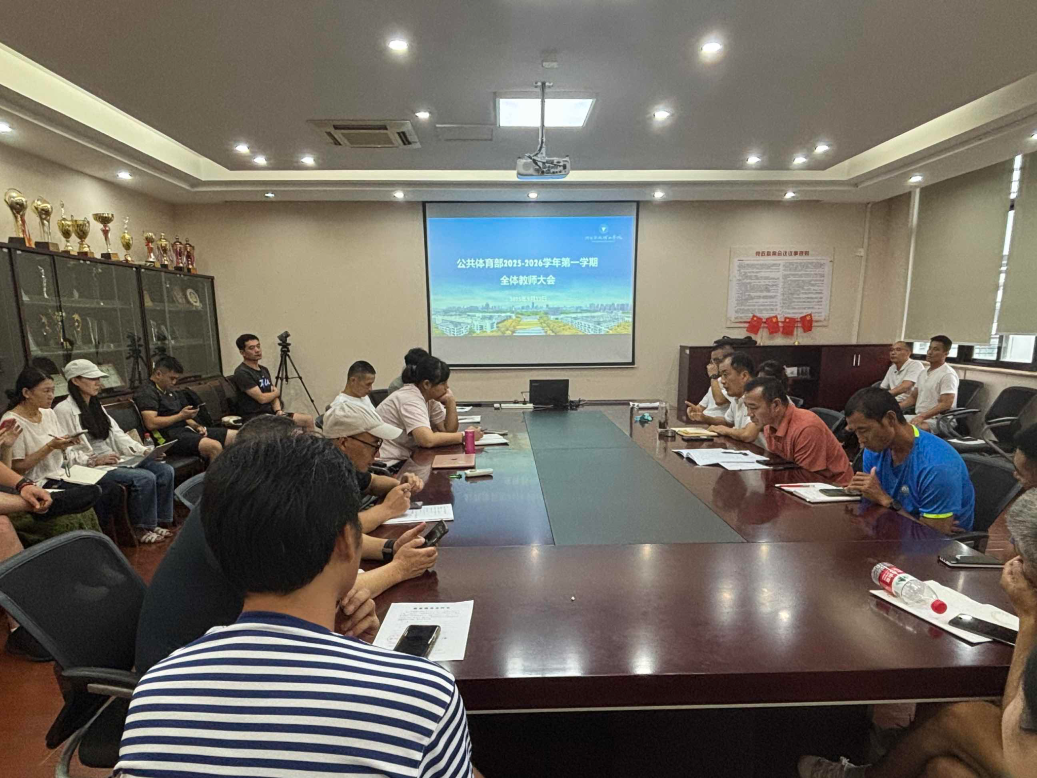 会议伊始,史经理首先代表部门向全体教师致以新学期的问候,并对新加入的教师表示热烈欢迎。他回顾并肯定了上一学期部门在体育教学、群体活动、竞技体育等方面取得的优异成绩,同时围绕“强化课程思政建设、深化教学改革创新、提升员工体质健康水平” 三大核心任务,对新学期的重点工作进行了全面部署。接着,负责教学、竞训、校运会、体测、群体、场馆的老师对新学期的相关要求做出讲解,并对10月份的校运会进行了提前筹备。